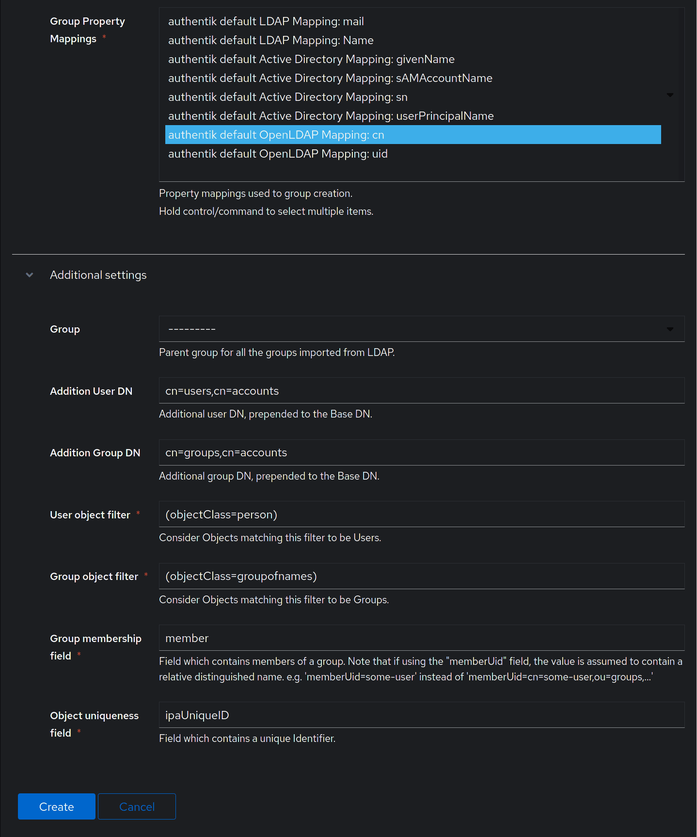 • Group property mappings: Select "authentik default OpenLDAP Mapping: cn"
